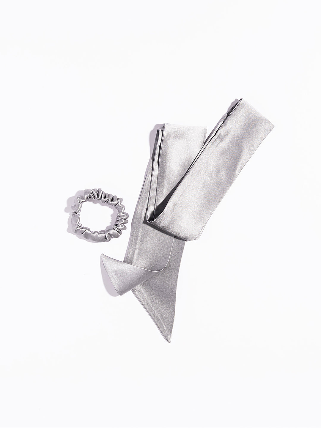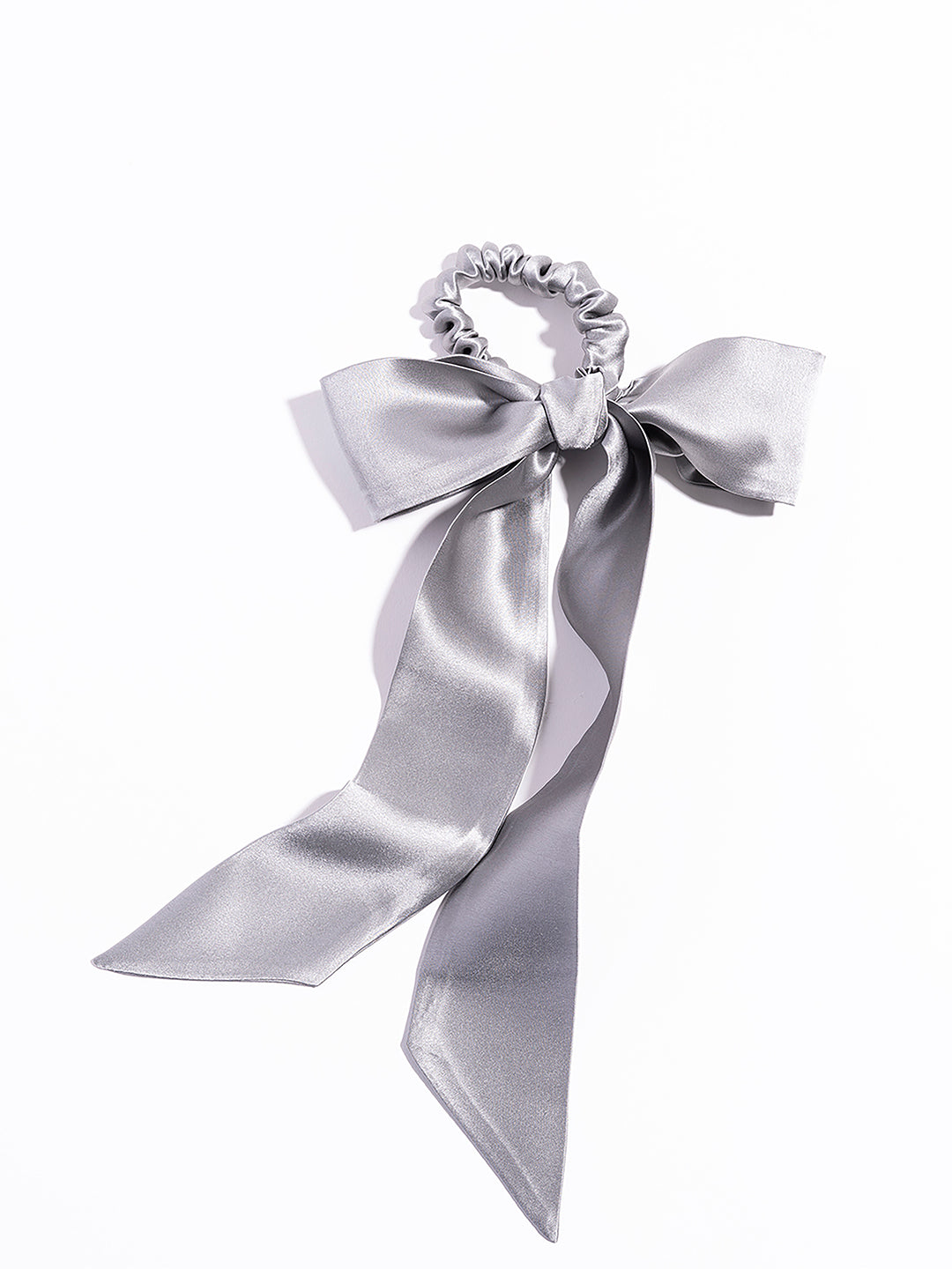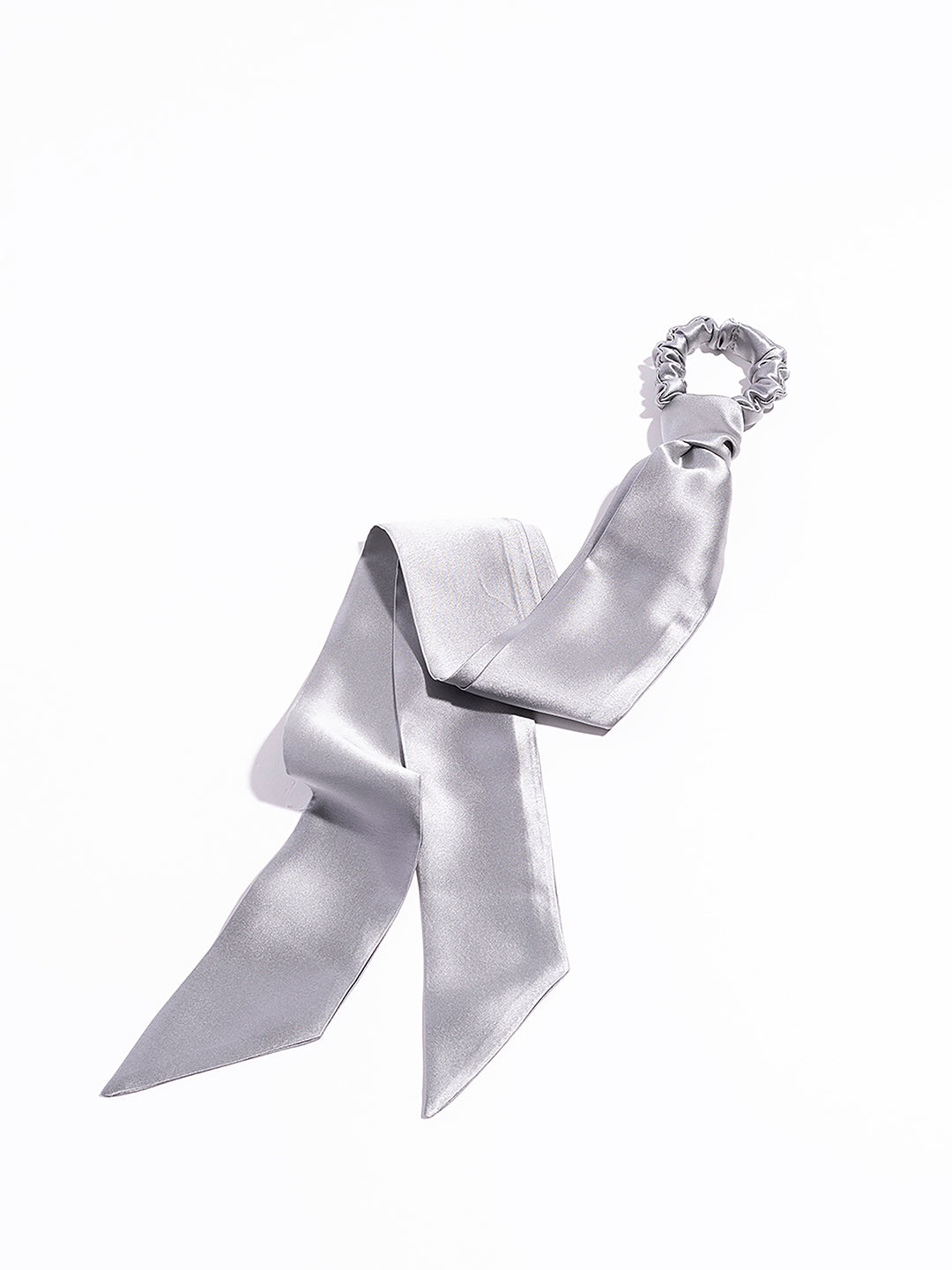 シュシュとリボンのセット。柔らかなシルクで作られたシュシュ。保湿性のある上質なシルクは摩擦を軽減し、髪の⽑に優しい素材です。シルクの光沢感はシンプルながらもインパクトがあります。柔らかくさらっと垂れたリボンが女性らしさを際立たせます。リボンは取り外し可能なので、別使いで色々なアレンジが楽しめます。オケージョンには勿論、カジュアルな服装にさらっと使っていただきたいです。オリジナルポーチつき
