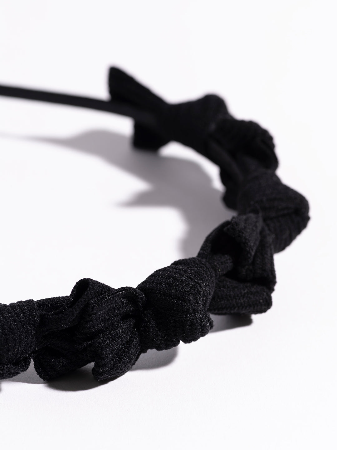 オリジナルのリボンが並んだカチューシャ。コーデュロイ生地でカジュアルさを出しつつも、リボンの一つ一つのフォルムが華やかさを演出してくれます。使ってみると甘すぎない印象で、非常につかっていただきやすいTRESSEらしいデザインになっています。シンプルなコーディネートの時に使っていただきたい一品です。オリジナルポーチ付き