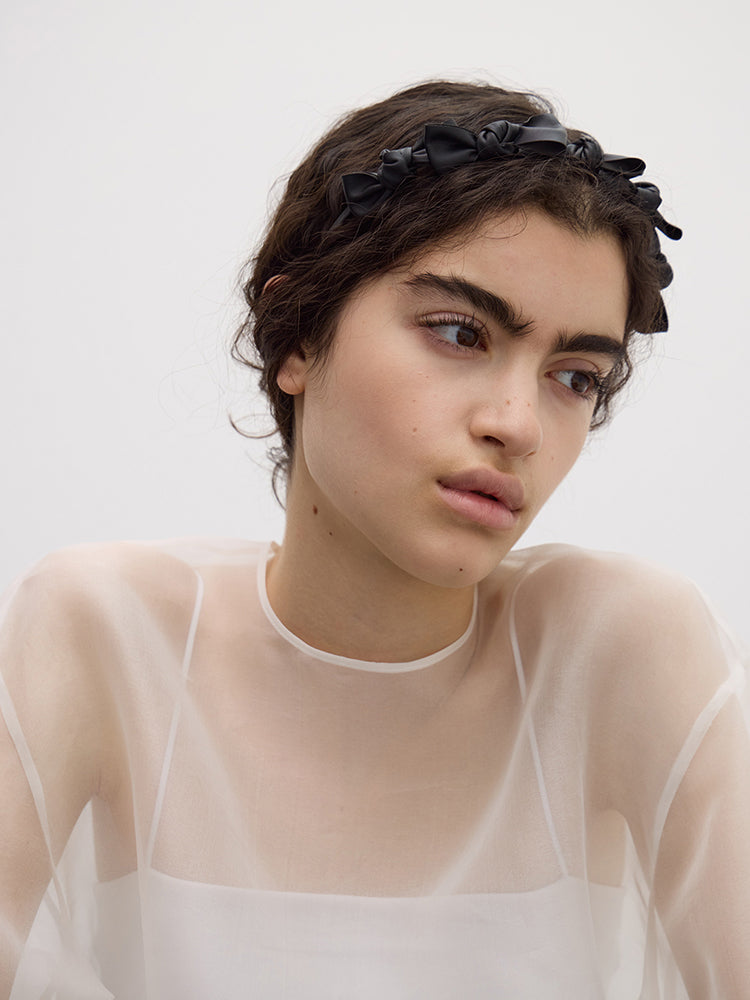 リボンが並んだ立体的なデザインは、つけていないときも目を引く存在感。ヘアスタイルに悩む日も、これひとつでぐっと洗練された印象に。