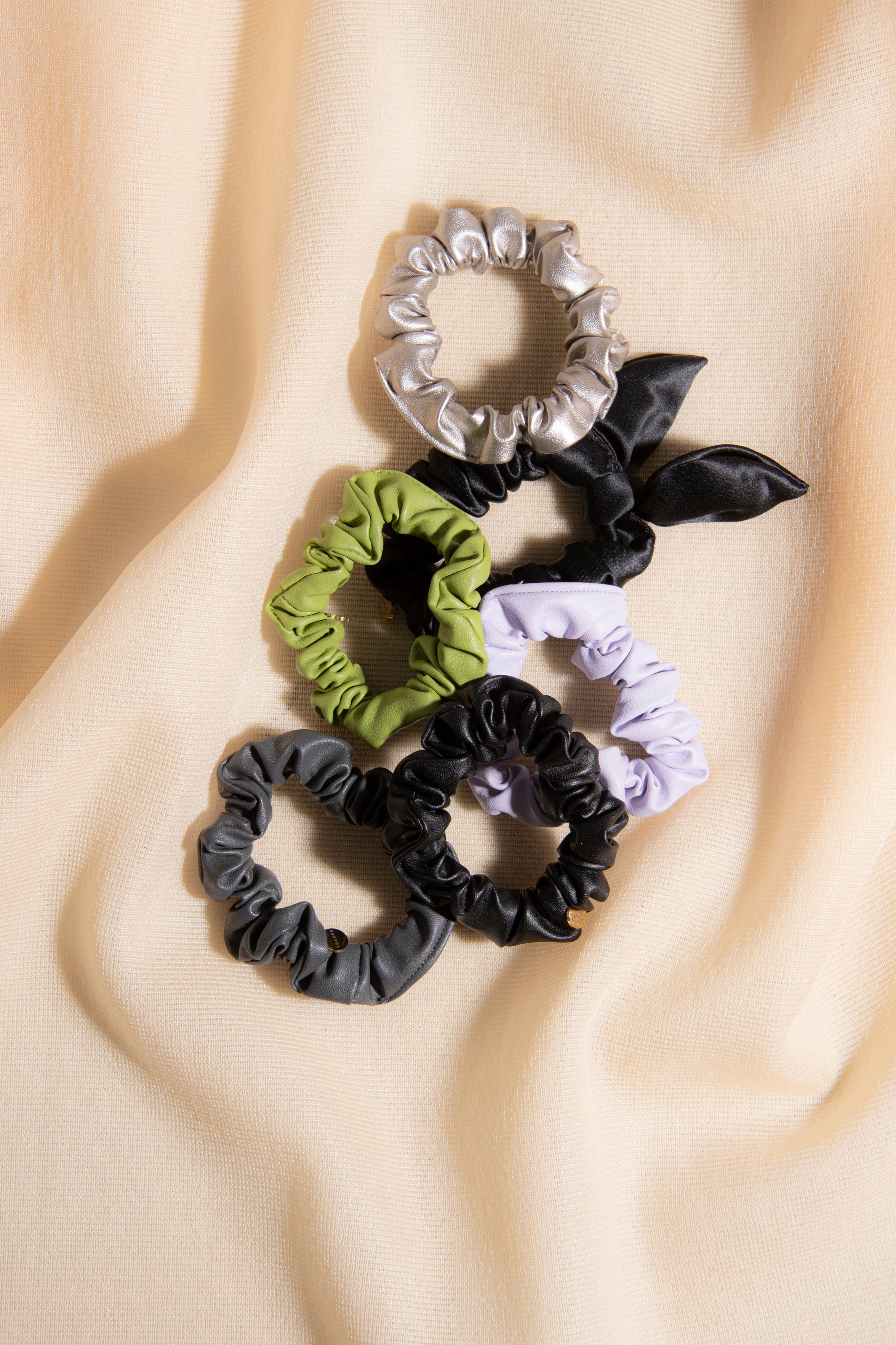 大人気のシルクのRUBANシュシュとヴィーガンレザーを使用したLOLAシュシュのセット。