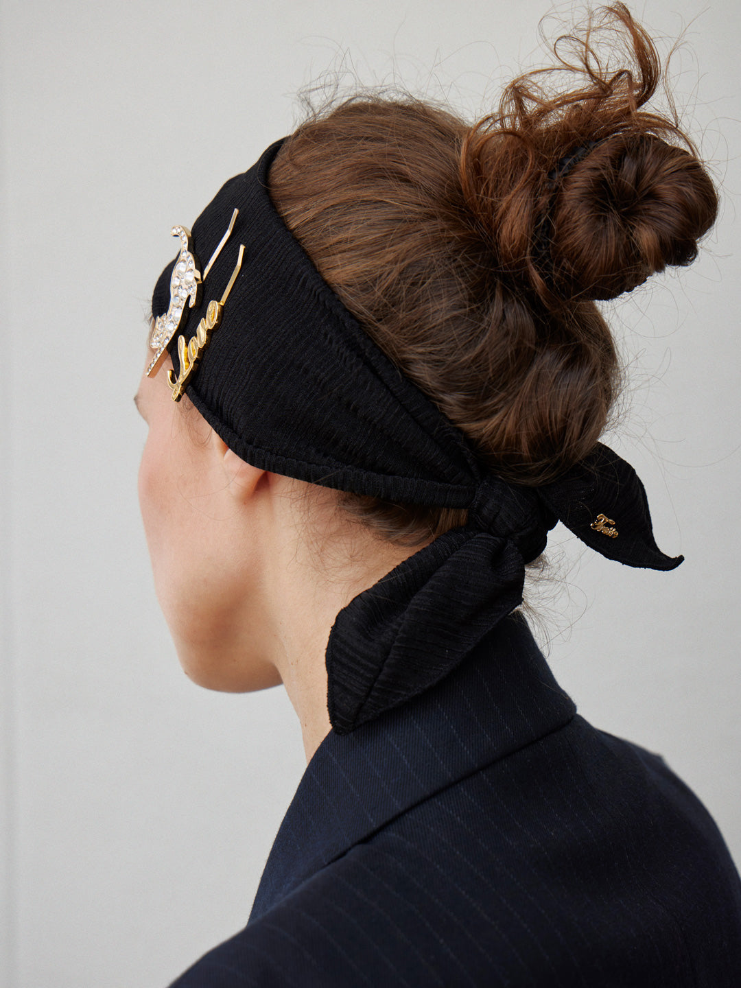 きゅっと結んだだけのシンプルな太めのヘアバンド。色々なシチュエーションで使っていただけます。さり気ないTRESSEのロゴチャームもポイント。メンズライクなスタイリッシュなスタイリングにおすすめです。