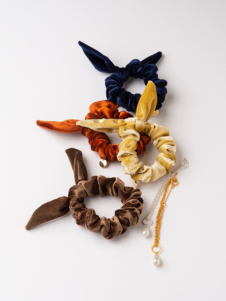 サラースのジュエリーのブレスレットのトップをシュシュにつけたり、重ねてつけても可愛いセット。アレンジが楽しめてコーディネートの幅が広がるアイテム。ベロア素材が秋の訪れを感じさせてくれます。専用ボックスつき。