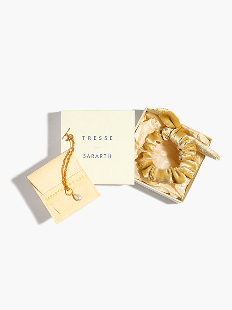 ブランドローンチから自然と共存するサスティナブルな生産背景や社会貢献に心を砕くSARARTHとTRESSEがコラボレーション。SARARTHからは初めてローンチされるヴィーガンパールを配したブレスレットと、TRESSEで人気の高いシュシュを特別なセットにしました。