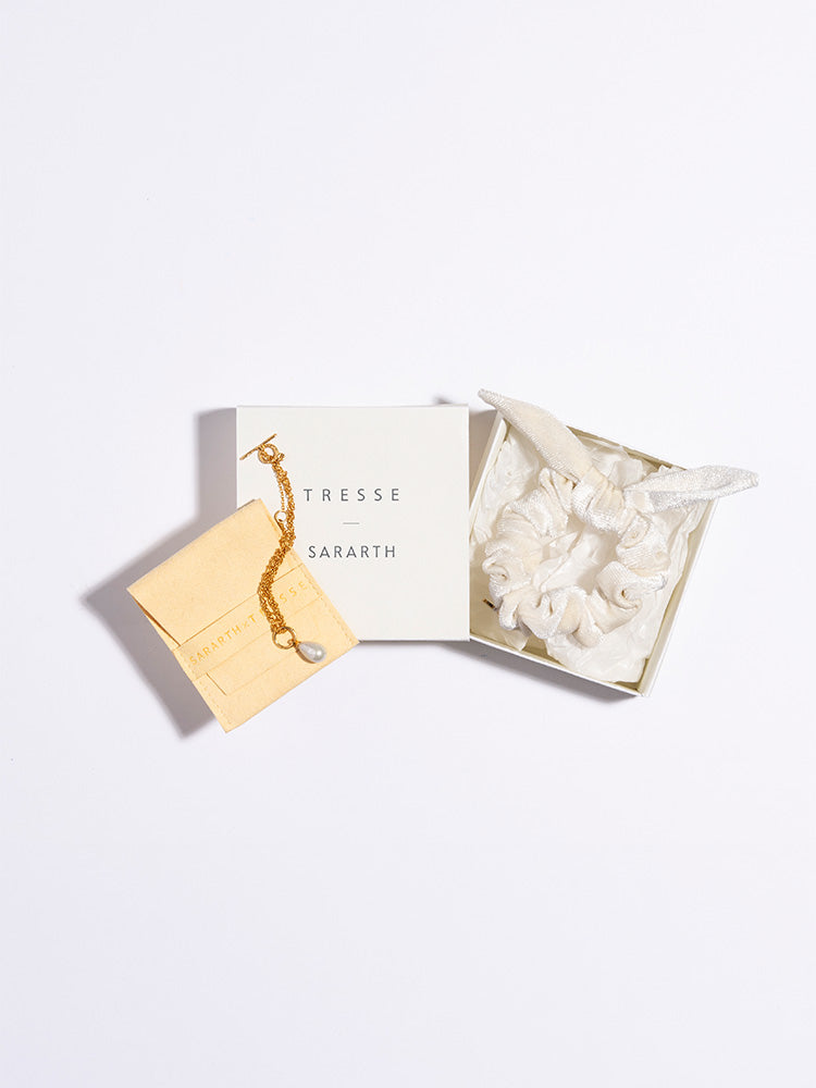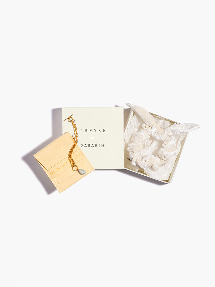 ブランドローンチから自然と共存するサスティナブルな生産背景や社会貢献に心を砕くSARARTHとTRESSEがコラボレーション。SARARTHからは初めてローンチされるヴィーガンパールを配したブレスレットと、TRESSEで人気の高いシュシュを特別なセットにしました。