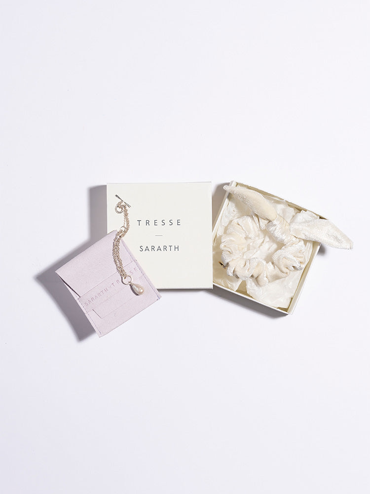 ブランドローンチから自然と共存するサスティナブルな生産背景や社会貢献に心を砕くSARATHとTRESSEがコラボレーション。SARARTHからは初めてローンチされるヴィーガンパールを配したブレスレットと、TRESSEで人気の高いシュシュを特別なセットにしました。